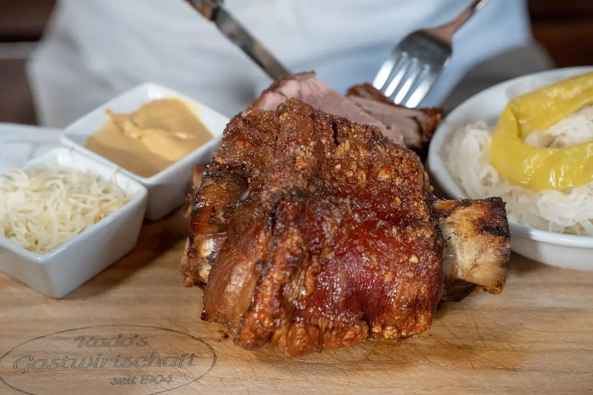 Eine weitere Spezialität unserer Familie ist die knusprige Stelze. Diese wird in unserem Hause klassisch mit Krautsalat, Ölpfefferoni, Senf, Hausbrot und frisch gerissenem Kren serviert.